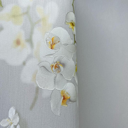- Пятый сет выполнен в флористическом 3D-стиле и представляет собой шикарные ветви орхидей. За счет изображения высокой четкости, определенного нанесения текстуры на полотна обоев, на стене создается объемный эффект.