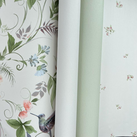 - Третий сет представляет собой ветви с хрупкими бутонами и листьями, среди которых парят райские колибри - все это передает изящность и изысканность вашему интерьеру. Мотив идеален для стиля прованс.